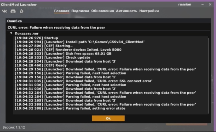 [19:04:32 264] [Launcher] Download failed, 'CURL error: Failure when receiving data from the peer'